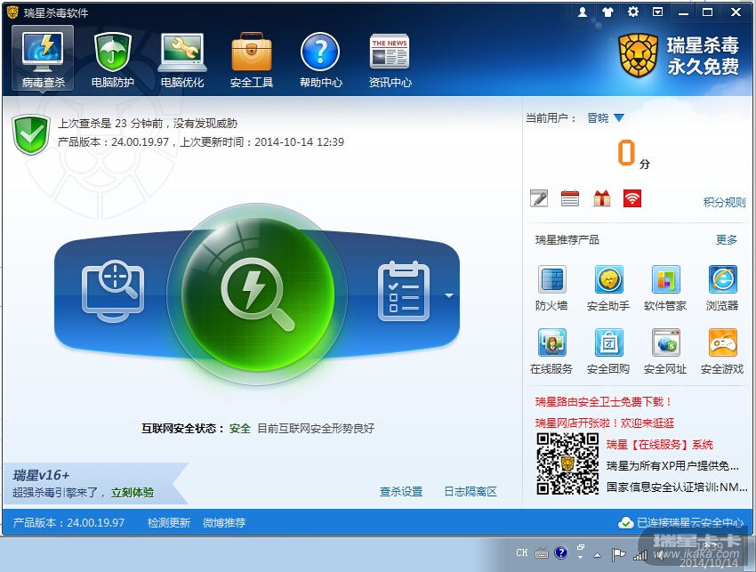 :kaka1: 瑞星工程师20,登录到网页用户中心后有积分。