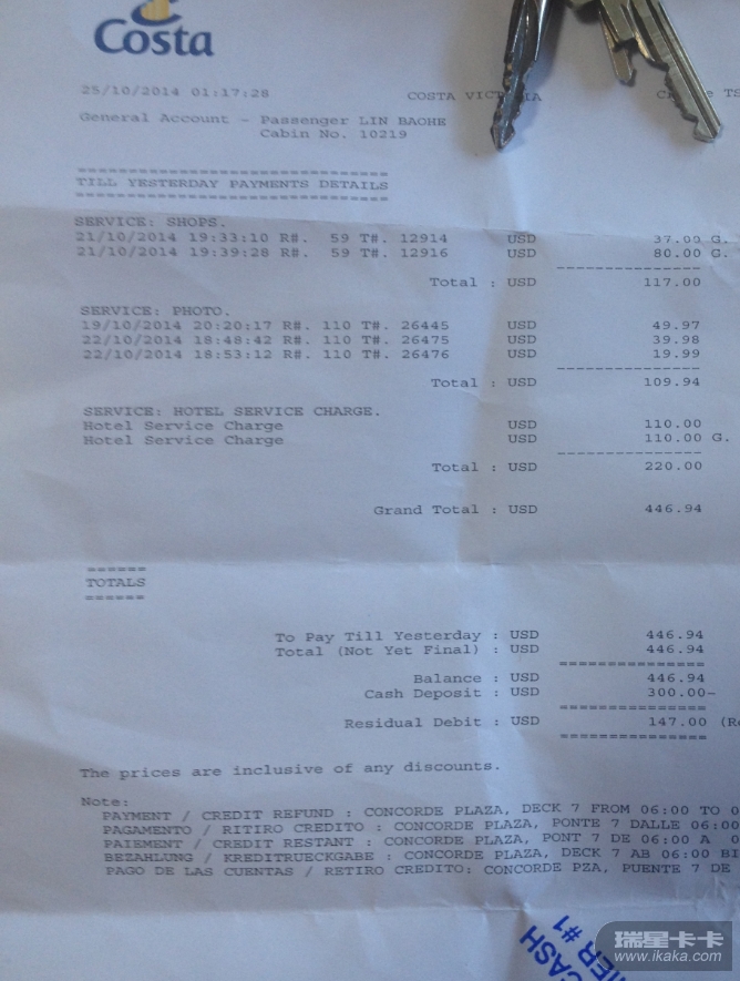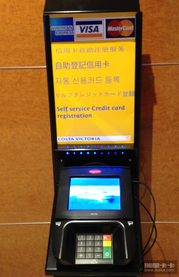 船上的所有消费均为“无现金消费”。游客需要将自己的信用卡与哥诗达卡(进入客舱时您会发现此卡已经放在房间的床上)绑定,船方认可可以用的信用卡有:VISA、万事达、美国运通;如果游客没有这三种信用卡,那就只能到船上7层的”协和广场“,在指定的时段里往您的哥诗达卡中预存现金(不低于150美元/人)。事实证明,绑定信用卡很方便,在服务生的指导下,在下图这个设备上指指点点几下即可搞掂。存现金则要排两次长长的大队(存钱一次,结账一次),很烦人。