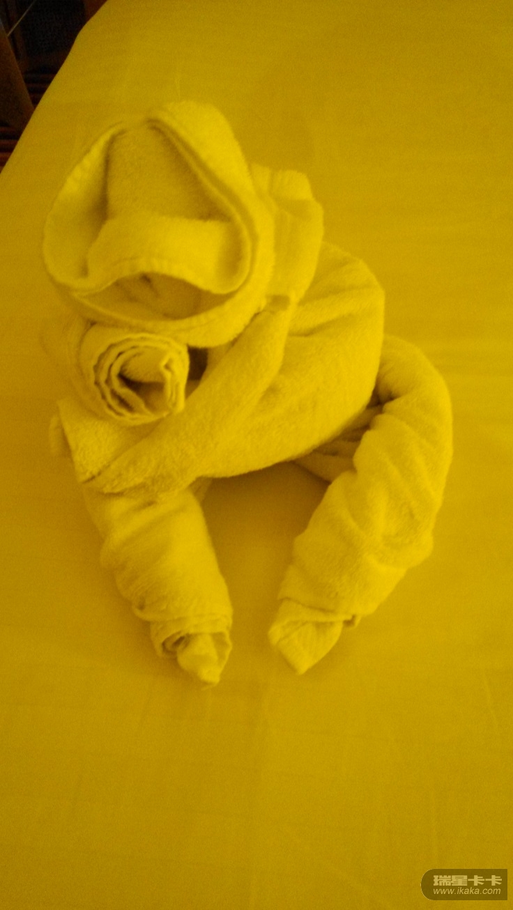 客房服务生会用毛巾秀自己的美工手艺:每天用毛巾折叠不同的动物,放在游客房间的床上。