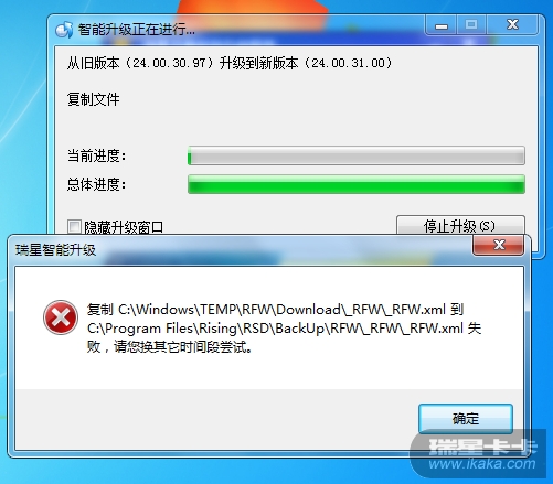 请楼主再重新升级试试,如果还是有这个问题,请把C:\Program Files\Rising\RSD目录下updater.exe.log 压缩发来。