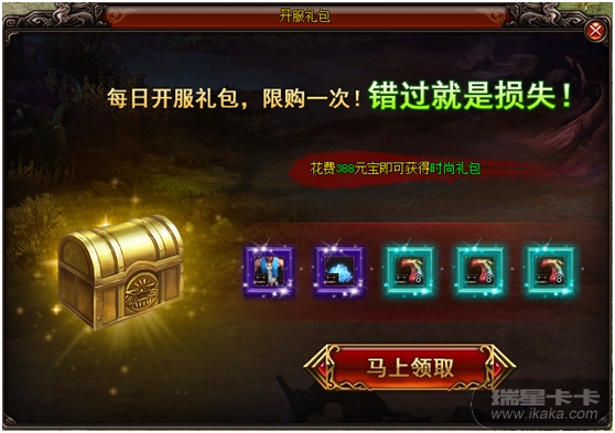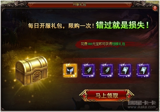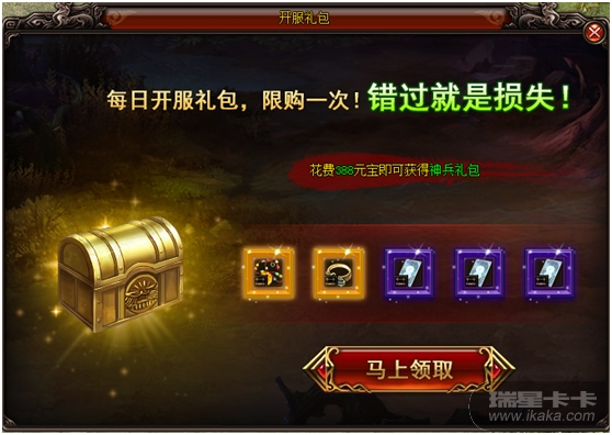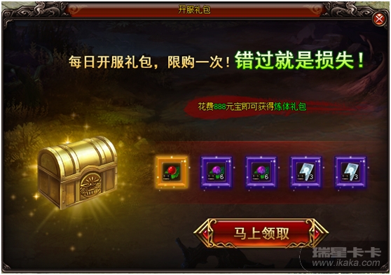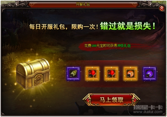 天开启开服限购活动,每日可XXX“开服礼包”一次。