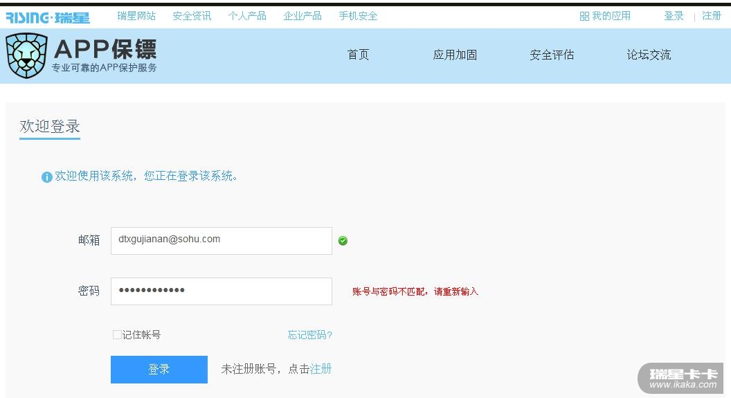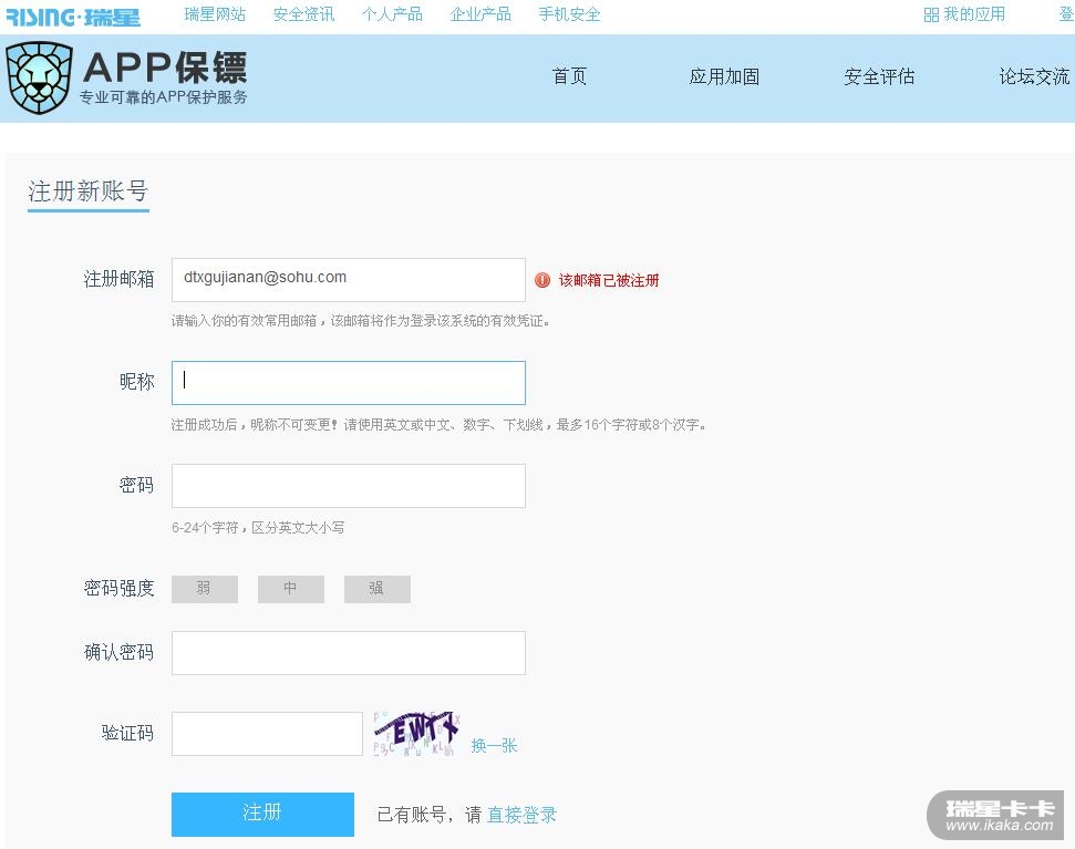 试用APP保镖时,发现瑞星的账号登陆不了。为什么呀!账号是昏晓。注册时发现“已注册”的字样(如图所示)