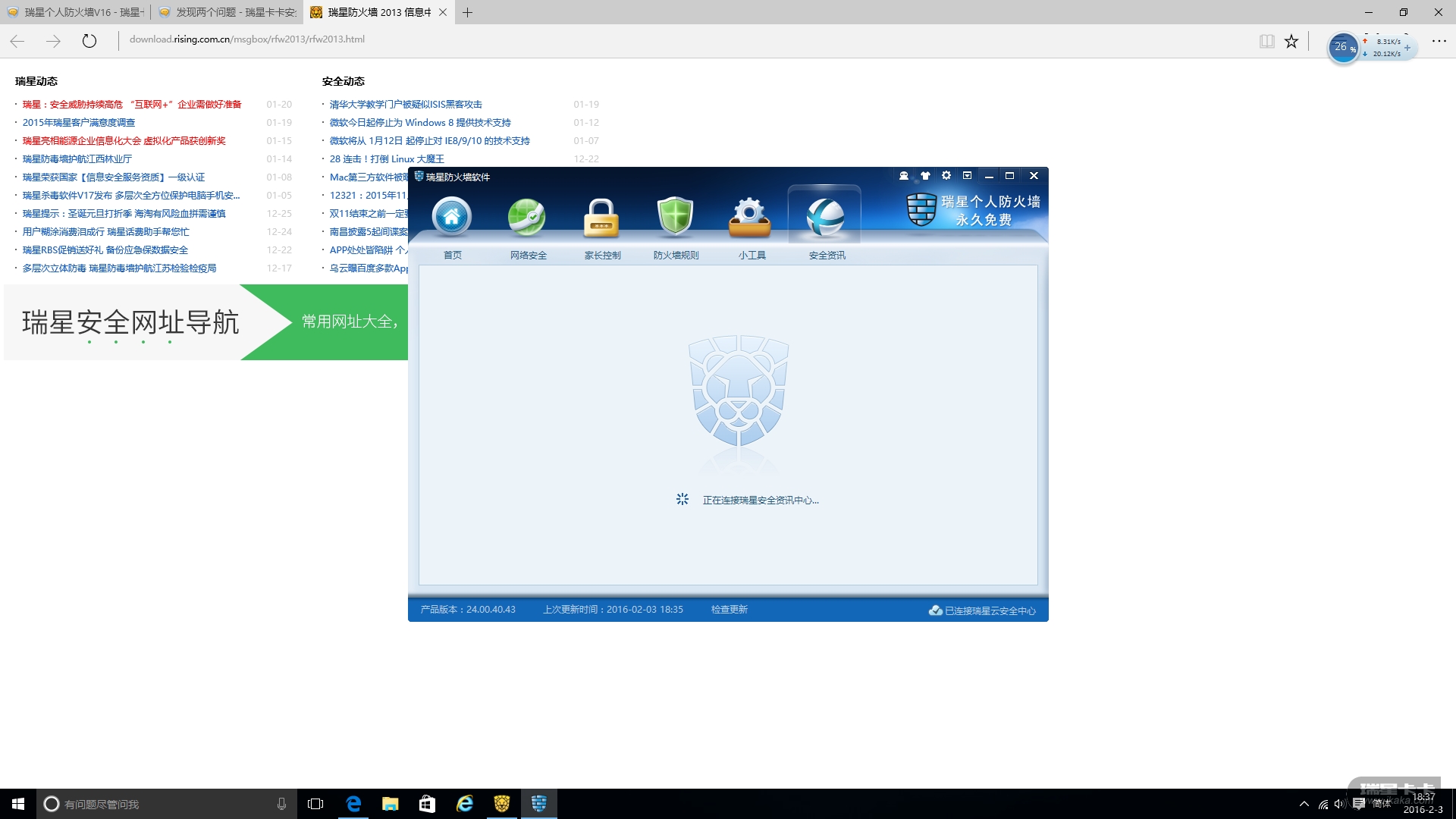 瑞星官网、卡卡论坛均可访问正常,而且在同一网络环境下只有安装Windows 10系统的机器会出现问题二,Windows 7的机器没有问题。
