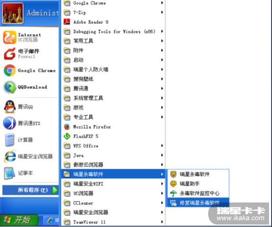点屏幕左下角的【开始】菜单,找到【程序/所有程序】--【瑞星杀毒软件】,点击栏目中的【修复瑞星杀毒软件】: