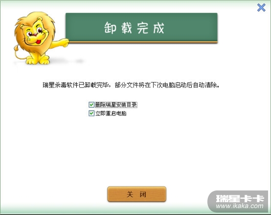 卸载过程完成后,勾选“删除瑞星安装目录”和“立即重启电脑”,并点击“关闭”,重启电脑: