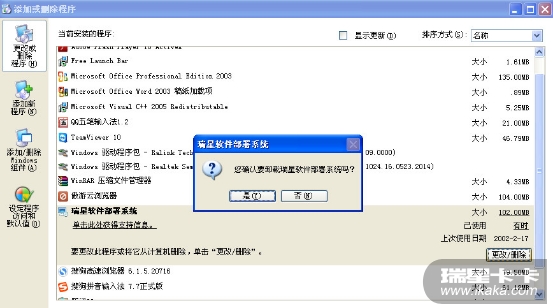 点击【更改/删除】,提示“您确认要卸载瑞星软件部署系统吗”,点击“是”,删除瑞星软件部署系统: