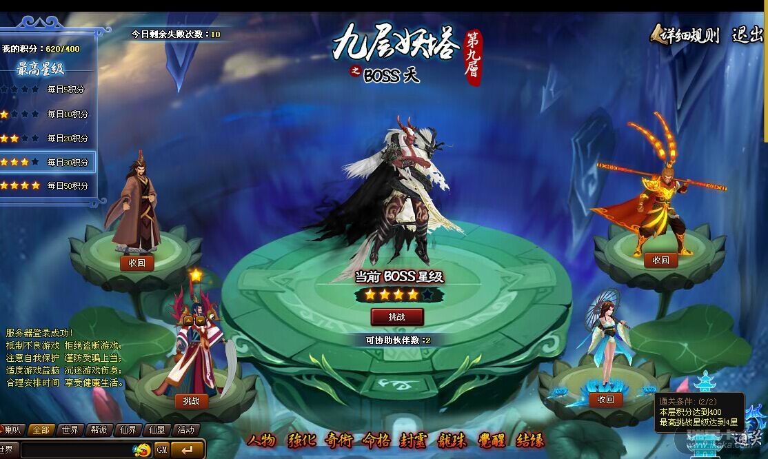 瑞星34区非诚勿扰,猪角成圣界面只剩妖塔这一个灰色的,我昨天已经四星过了第九层,妖塔积分620,妖塔右下角的通关条件已经满足,可是点不了通关,请斑竹帮我看看是怎么回事。:kaka4: