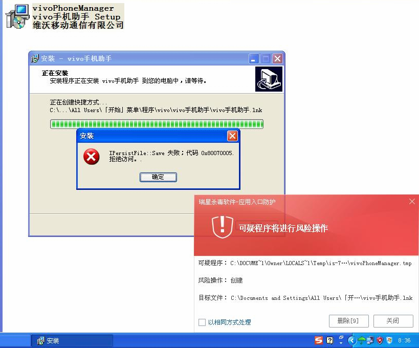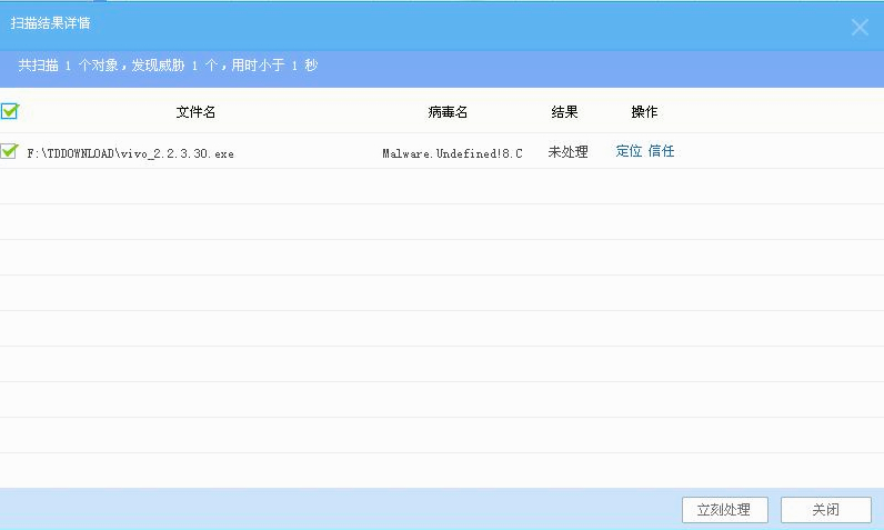 真是秒杀哦!我头天下载ViVo手机助手软件包时还没有事,第二天只把存放软件的文件夹打开,还没有安装,ViVo手机助手软件包就被V17杀掉了。其实我安装的V17的设置是发现病毒时“询问我”,是“手动处理”,而不是“自动处理”,怎么设置没有效呢?:kaka2: