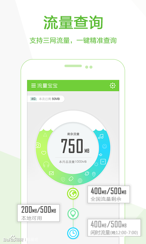 “流量宝宝”是一款专门为用户节省流量的监控工具,界面清爽简洁,操作简单方便,实时监控手机流量,让您用掉的每1K流量都清楚的知道它用在了哪里,这样您将不再是流量的奴隶,您将成为它的主人,专注呵护