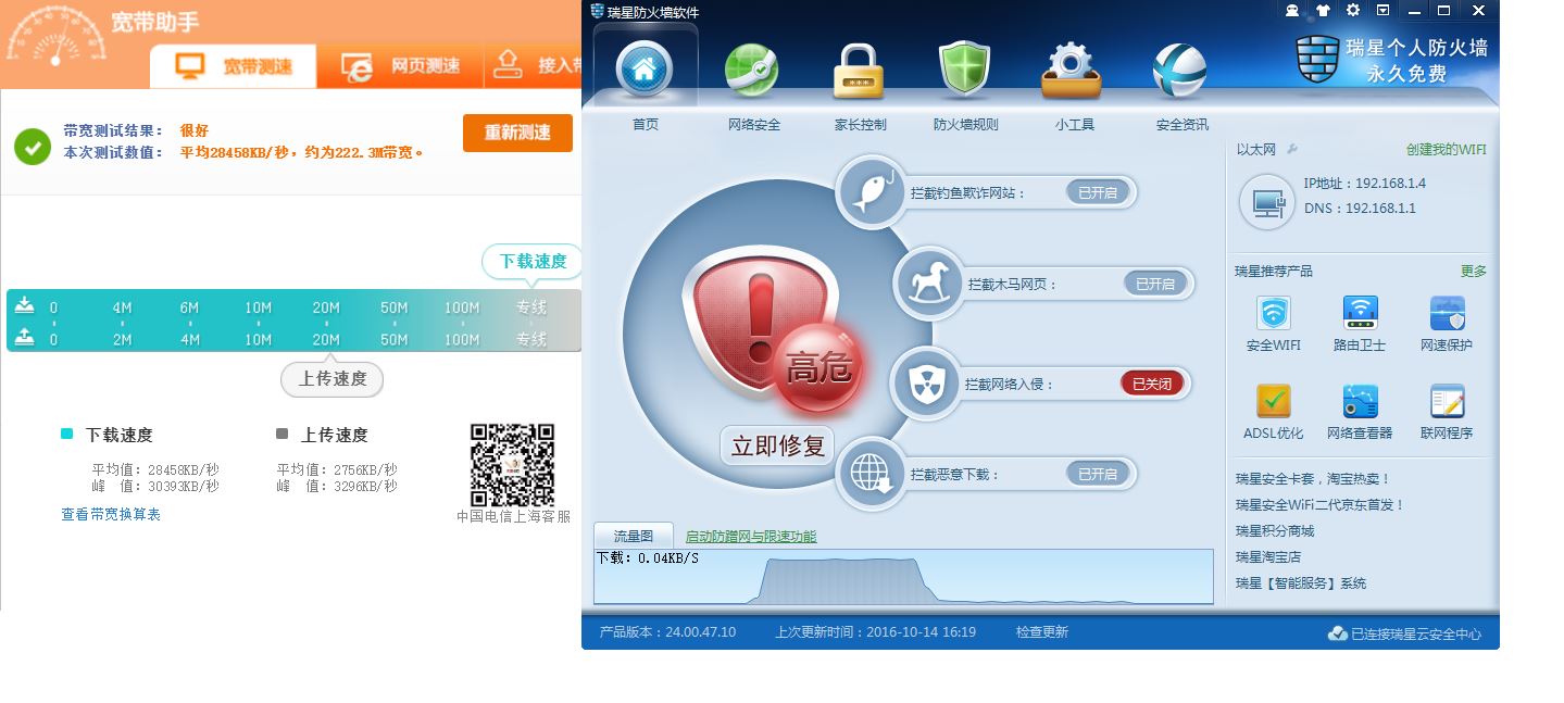 我十年前就用付费的瑞星,网速从2M升20,再升50M,又升100M,一直用瑞星,从没有改变其他品牌防火墙,测试也没有影响网速,上周刚升了200M,但测试最高只有150M,经自查才发现瑞星防火墙出问题,我想这老品牌的该升级,本来细小管子应换大的管子啊!期待!