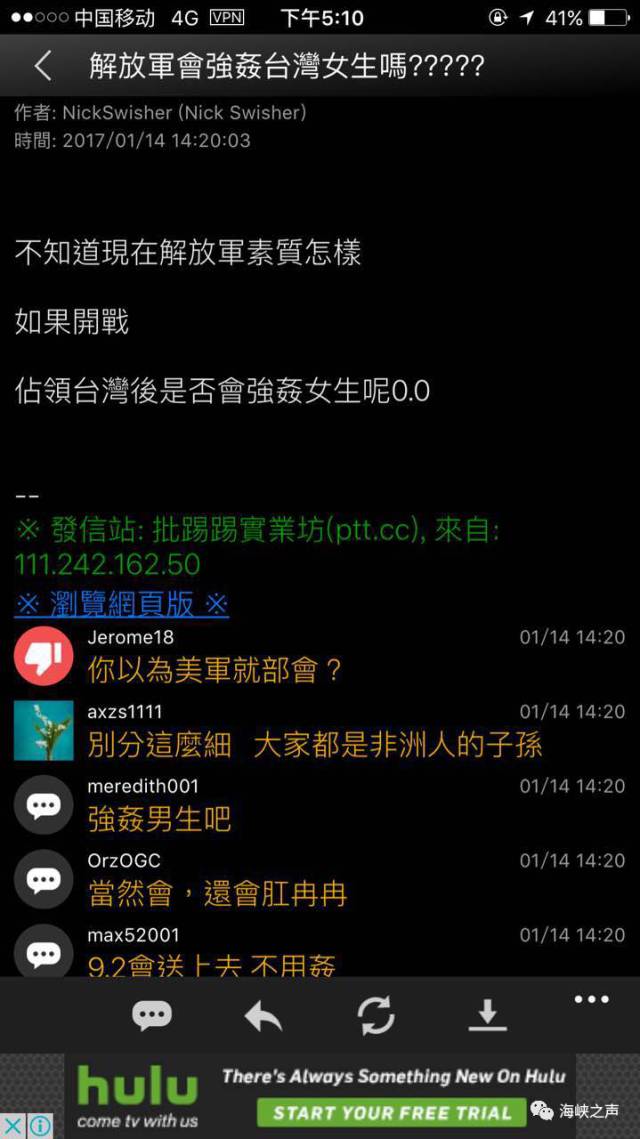以下为专访内容:辽宁号只是训练而已,将来也会保护台湾辽宁舰的事,我是在上PTT看到台湾新闻啊,那些网民就在说,雄三飞弹能打多远啊、如果解放军登岛,会不会强奸台湾女生啊什么什么的。我想说:为什么台湾的网友会问这么蠢、这么让人无法理解的问题?我看大陆新闻,辽宁号只是训练而已,我完全没看到大陆有任何讯息要打台湾,但台湾的网友非常的紧张。大陆人真的都对我很好,没有感觉到大陆人对我的敌意。除非台湾那个官,他那么白痴真的先射了两枚给辽宁号。不然也不会打吧。