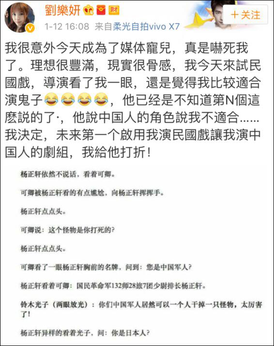 针对辽宁舰绕台一事,刘乐妍表示辽宁号保护台湾,那台湾就不用再跟美国花钱买军购,我们可以专注地把钱建设台湾,这是对台湾很划算的事。有人说她跪在中国人的面前,跪在人民币面前,她回应道:“什么叫跪在中国人面前,对!我不但要跪在中国人面前,我还要给中国人磕头,因为我是中国人的后代啊。”拿着台北人身份证的刘乐妍,曾经以为台湾是世界最厉害的了,但是来到北京之后,看了大陆这么多地方后,才觉得还是要出来走走。如今的刘乐妍,准备在河北定居,不会再回台湾了,台湾综艺节目已经快要倒光了,已经没有竞争了,而在大陆,市场大需求多,有竞争,至少知道考场在哪里,“我就跟他们一起,拼就拼嘛,北电中戏上戏,去嘛。我就跟他们一起竞争。”此前,刘乐妍曾在微博上自曝,被导演认定只能演鬼子,导演说中国人的角色不适合她。刘乐妍愤慨决定,降价出演中国人,求一个民国戏分。
