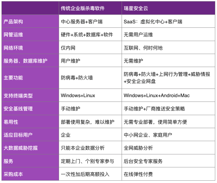 瑞星安全云是国内第一款基于SaaS模式的专业安全产品,该产品将颠覆传统企业安全产品服务模式,相对于其他企业安全产品,“瑞星安全云”无需硬件投入、专业部署以及后期专业运维,企业所有终端设备安装即用,用极低的成本就可实现对公司网络安全的全面管控,防止病毒木马入侵对公司业务发展造成损失。(瑞星安全云产品地址: