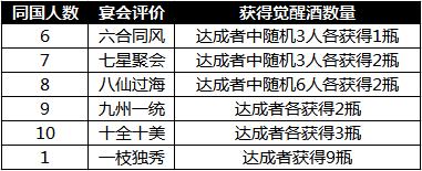 g)    参宴的10人中,同一国家的人数越多,该国玩家获得的宴会评价越好,可获得觉醒酒、点券数量越多。