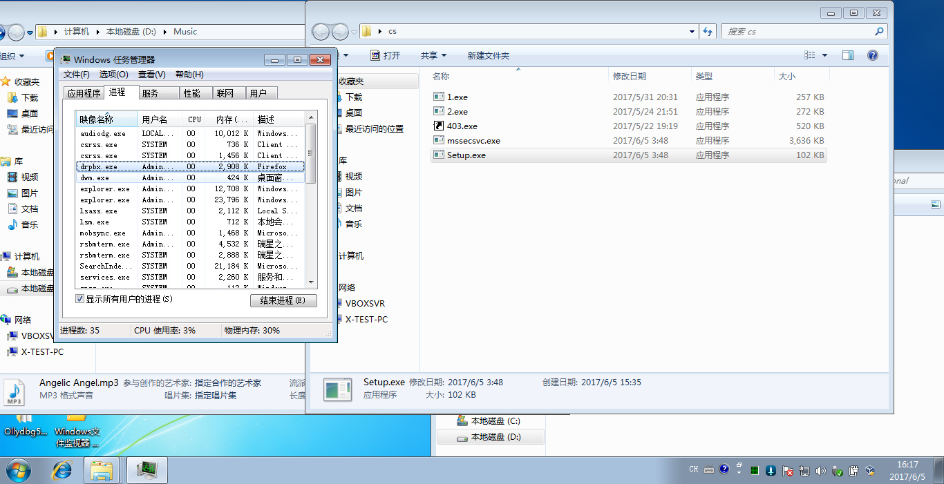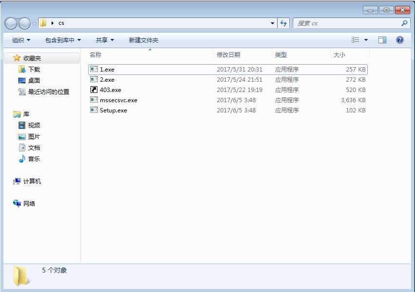 第四个样本是非常知名的WannaCry勒索软件,经历了15分钟的等待之后发现病毒没啥动静。在我的实机沙箱环境下进行行为对照之后发现在虚拟机里有个衍生物没有执行起来,导致后续行为无法执行,故该样本跳过。