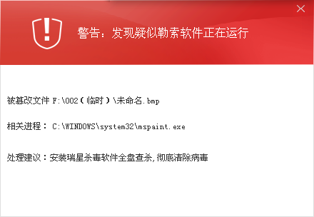 我打开了两个系统自带的画图程序(C:\WINDOWS\system32\mspaint.exe),进行一些简单的图像编辑操作。我从其中一个画图程序向另一个画图程序复制,然后保存,这时,瑞星之剑就将画图程序拦截,弹出警告窗口。正在执行保存操作的那个画图程序被强行关闭,正在保存的图片文件变成了空的,0字节。反复试过多次,都这样,真是好烦。