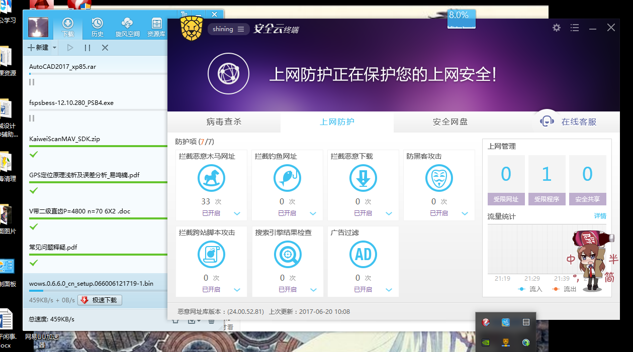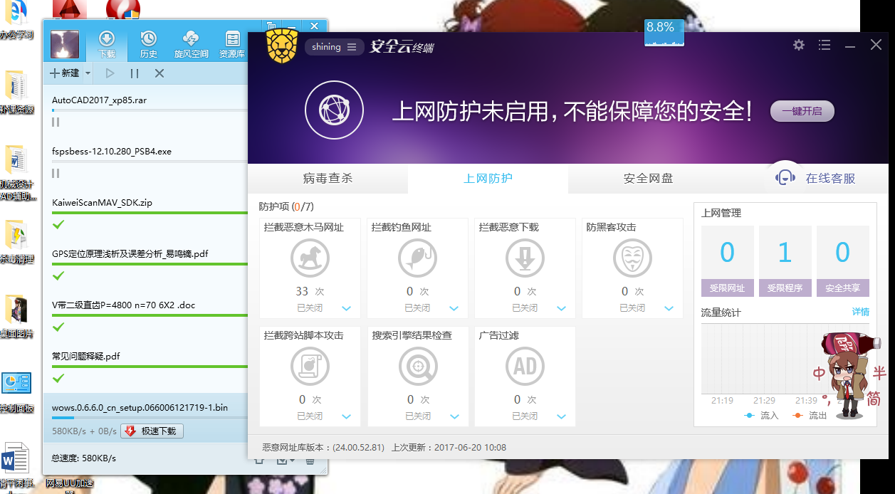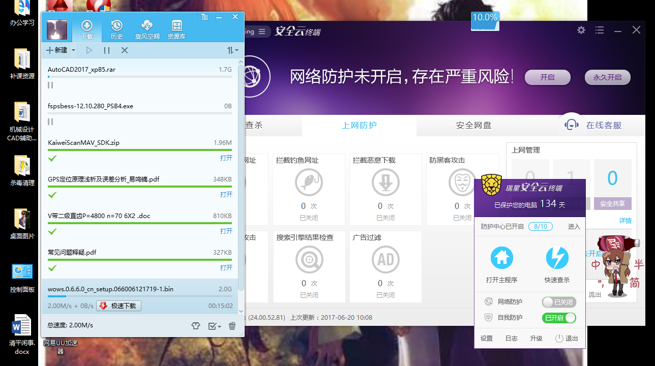 现在用安全云突然发现安全云的卡网问题严重,不知道是不是设置的问题还是其他问题,具体的卡网现象很严重,本人win10教育版,qq浏览器,下载软件qq旋风和IDM,在安全云正常启动防护全开的时候,常见网页打开缓慢,但缓慢的不是很明显,但是对于一些小网站小论坛之类的会出现根本打不开的现象,转了半天,最后提示打开有问题,关闭安全云正常打开。除此之外,还体现在下载方面,可以说这方面是非常明显,用旋风或IDM下载东西,开安全云的时候300多K,400多来回转,但是安全云关闭退出后,下载速度立刻上1.X兆,即便不用这两个下载器,换用一些游戏自带的高速下载器,也是如此,差距非常大。希望能够尽快改善此现象,卡网有时真的很头疼!对了,补充一句,本人校园电信网,20M带宽。