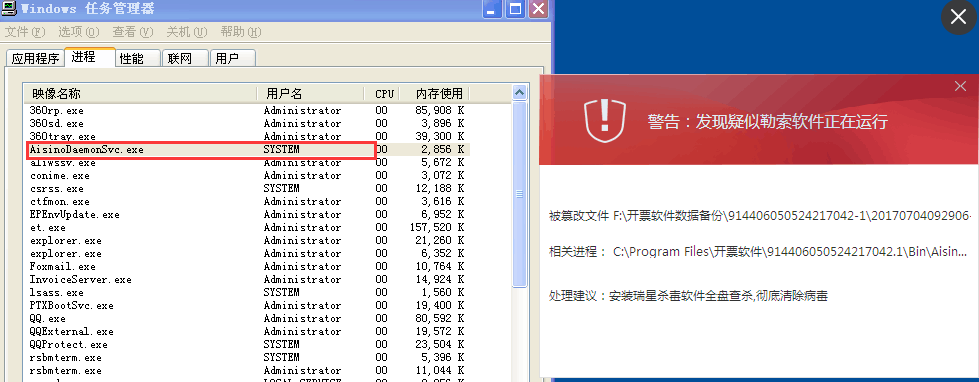 在执行备份动作之前,进程Aisino.Framework.Startup.exe是存在的,一执行备份动作该进程就被杀死,并报疑似勒索病毒的报错信息