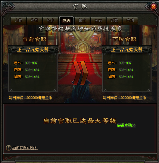 玩家通过控制面板的角色按钮进入官职,使用功勋来提升自己的官职。