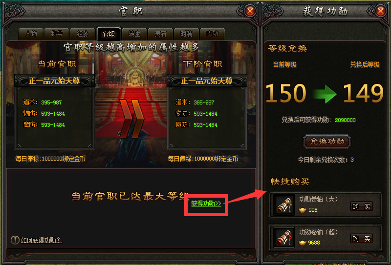 通过完成每日任务获得功勋、击杀BOSS获得功勋卷轴或者商城购买功勋卷轴来增加功勋。
