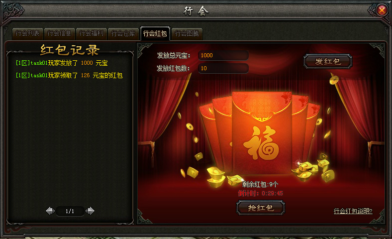 玩家可通过行会红包来跟行会里的玩家进行互动娱乐。