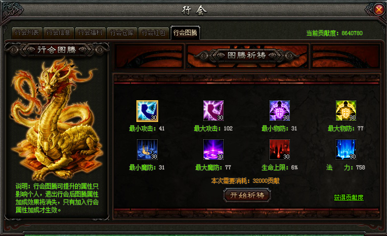 玩家可通过行会图腾消耗行会贡献度进行人物属性提升。