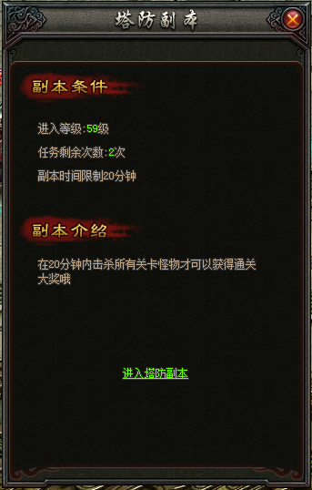 当玩家59级后在完成点击塔防副本NPC 打开NPC 面板即可进入副本
