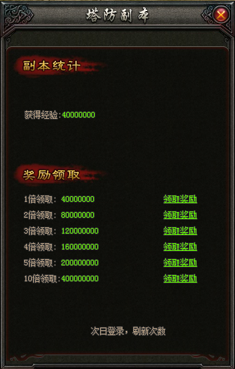 当玩家等级达到59级后每天可获得两次机会进入塔防副本,在副本中玩家在规定的时间内击杀所有怪物即可通关。当玩家通关成功后可获得大量经验奖励。玩家也可通过多倍领取获得更多经验奖励。