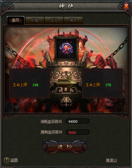 玩家可通过进阶血符来增加自己角色的生命上限。