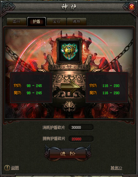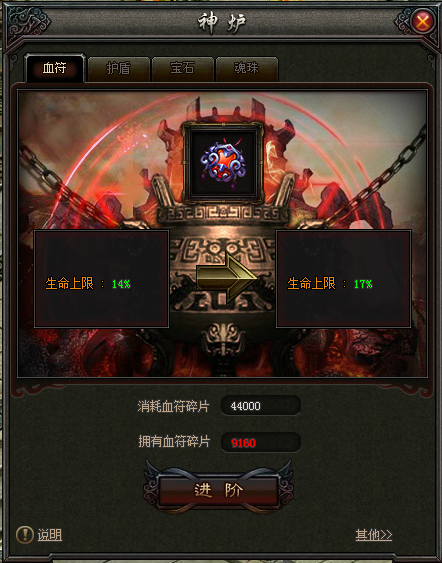 神炉可以炼化碎片提升玩家血符、护盾、宝石、魂珠等级。