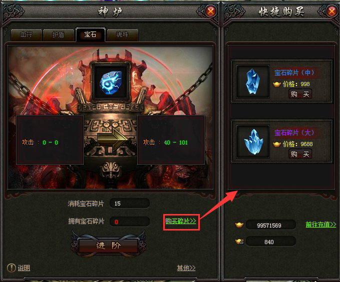 在游戏中神炉可以炼化碎片提升玩家血符、护盾、宝石、魂珠等级增加玩家的属性