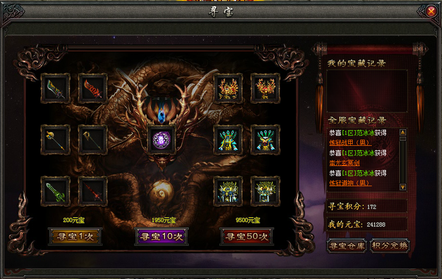 当玩家打开面板后,玩家通过使用宝藏钥匙和元宝进行寻宝