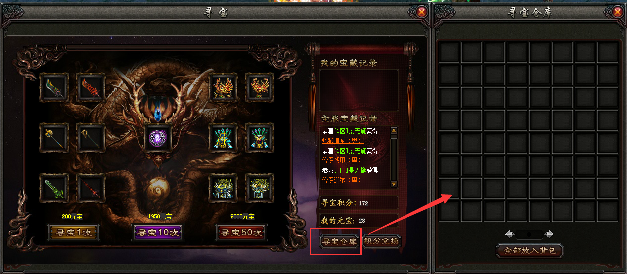 玩家点击宝藏寻宝仓库按钮便可打开仓库面板。