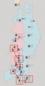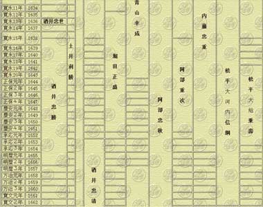 幕府在本岛东北地区通往江户的要道上安插的亲信势力。幕府还改良旧制,规定各藩大名每年要到江户参觐交代,并在江户建造府邸,身份越高,府邸的规模要求就高,于是地方各藩财政都用来繁荣江户基础设施建设,藩内经济拮据。