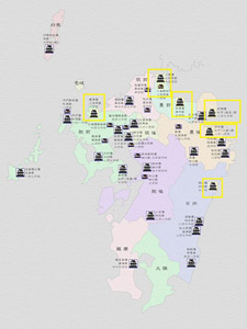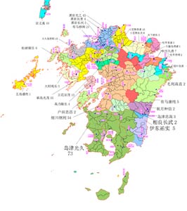 远离江户的九州岛外样大名众多,然而占据九州通向本岛和四国要道的,则是六个谱代大名(图中黄色框)