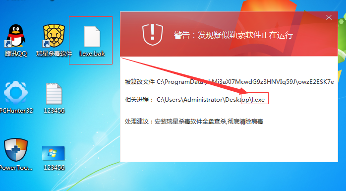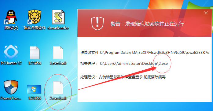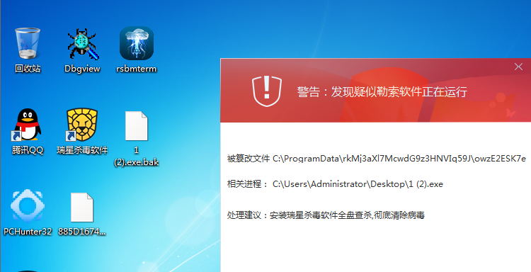 1、 瑞星之剑报警了 ,并且 将 病毒 文件,添加了 备份的 后缀 名