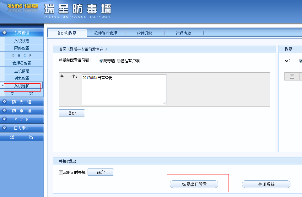 我现在在操作的是瑞星防毒墙,其型号是RSW-1600,我想做的是让这台防毒墙恢复出厂设置,但是我不知道该怎么做,因为找不到恢复出厂设置的操作,防毒墙的配置页面如下图所示,求高手指点!