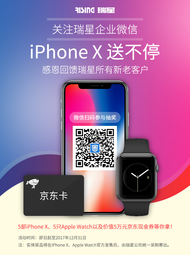 感恩回馈瑞星企业客户的一个活动,奖品是5部iphoneX、5只Apple Watch以及价值5万元的京东现金券:kaka1:等你来拿 :kaka12: