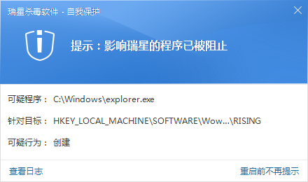 将瑞星更新至V17最新版之后,每次开机都会提示“影响瑞星的程序已被阻止”,如下图所示。进行杀毒后,结果是安全无异常。现将问题上报,求解决~