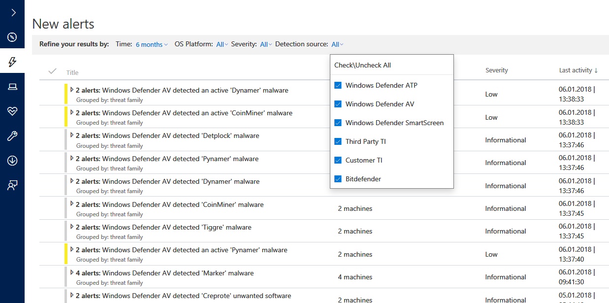 https://blogs.windows.com/busine ... Vrgi05ZtqjYXld5l.97Bitdefender, Lookout 和 Ziften目前已经支持了这个,在Windows企业版上,WDATP的后台可以直接看到来自他们的记录,如图所示: