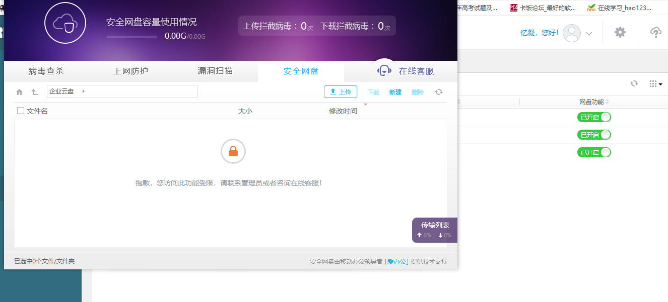 麻烦截个图发上来,安全云中心——安全网盘——访问控制 页,和网盘打不开的提示页