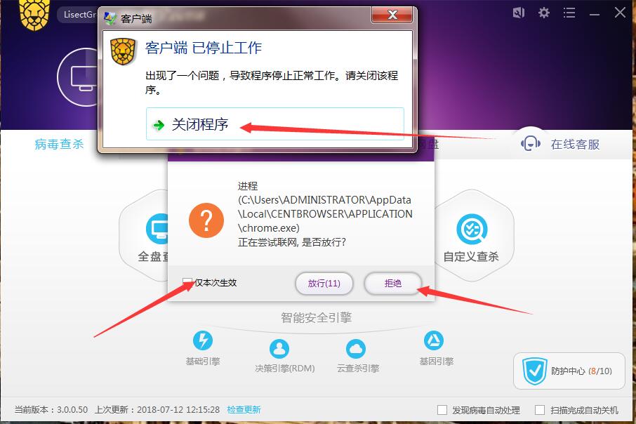 3:随便打开一个需要连网的程序,比如浏览器,会出现如图对话框,按下图箭头处选择,恭喜你,你的小狮子崩溃啦