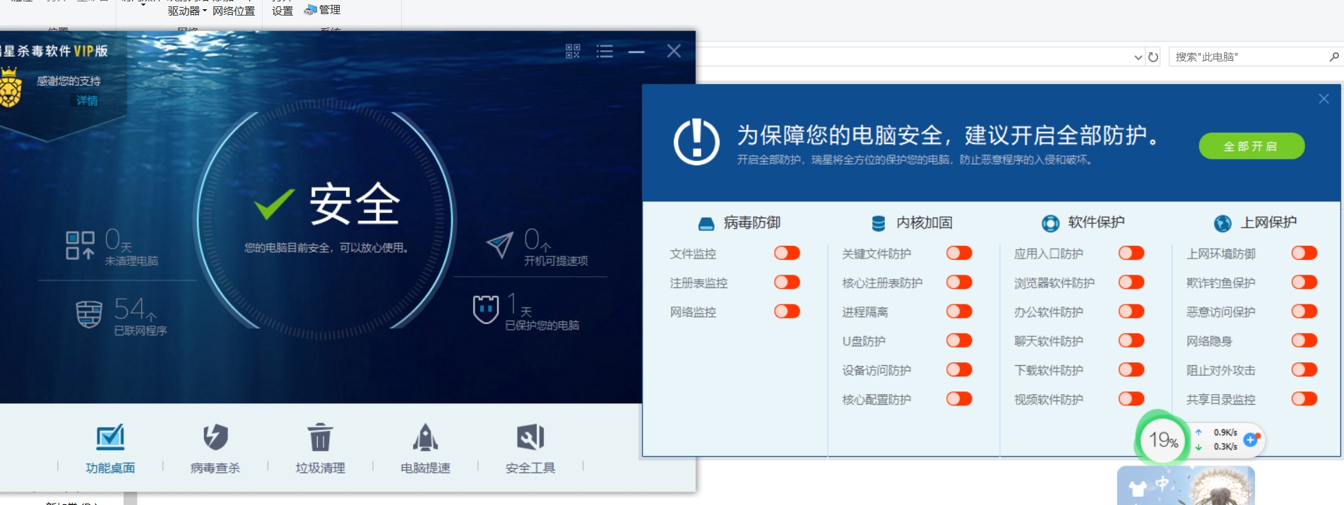 今天不知怎么的碰上和楼主一样的问题了,小绿伞变红色了。这个状态下修复过程中如果点“否”,会出现错误代码……,然后这个窗口就关不掉了,重启电脑就会蓝屏进不去系统。如果点“是”,过程进行完打开主界面,就是下面第二个图的样子。