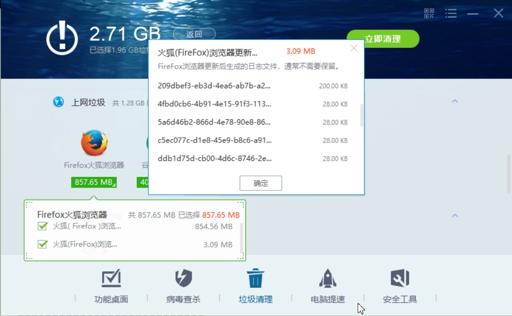 先说一下V17这个垃圾清理:这里显示的浏览器更新实际上清理的是Firefox的崩溃文件。