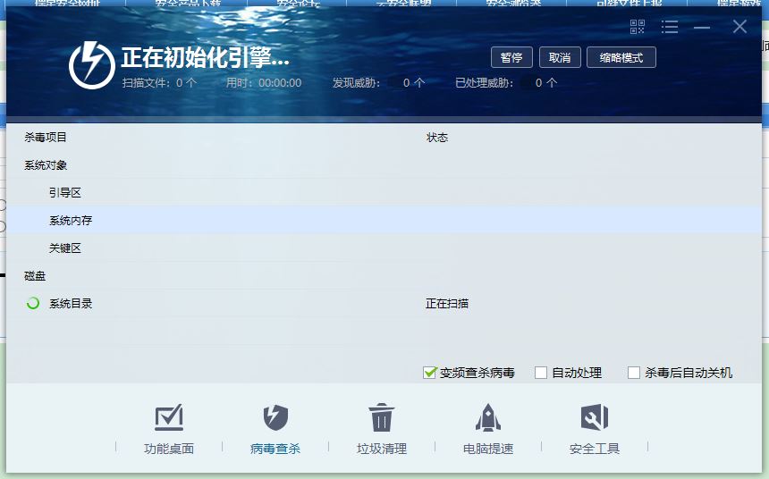 进入查毒界面 停留在初始化引擎界面不要关闭
