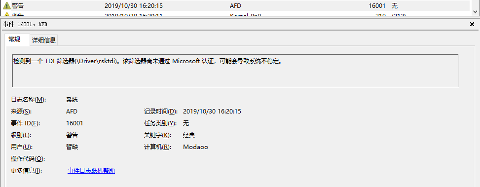 检测到一个 TDI 筛选器(\Driver\rsktdi)。该筛选器尚未通过 Microsoft 认证,可能会导致系统不稳定。