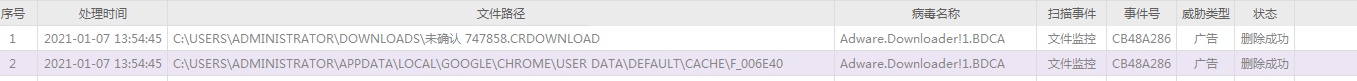 从下载站下文件,瑞星安全云终端的监控中途报毒,查看日志有两条记录,但路径不同,第一个是下载保存的目录,第二个是chrome缓存。