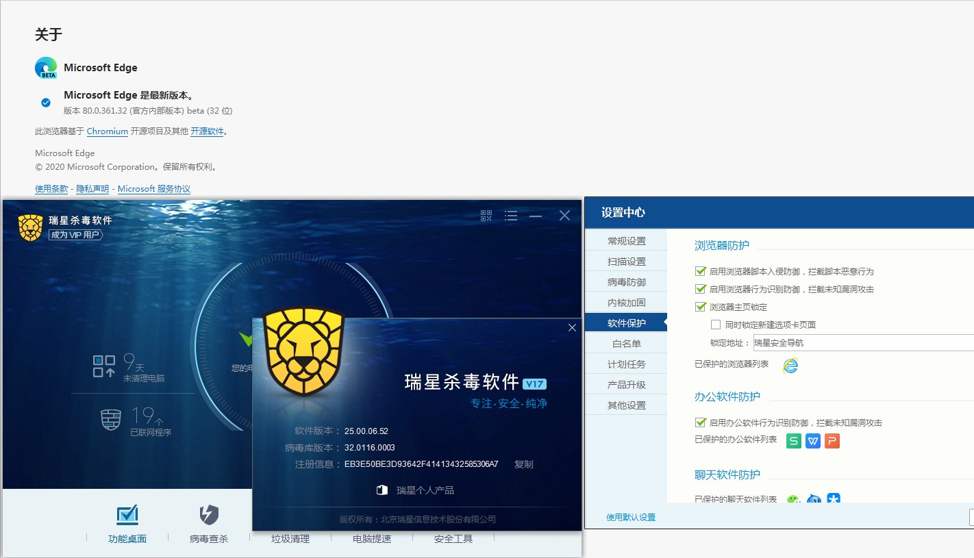 使用新版microsoft edge 浏览器时,发现瑞星杀毒没有把它列为保护对象。在以后的版中中希望看到它,谢谢!【如图所示】