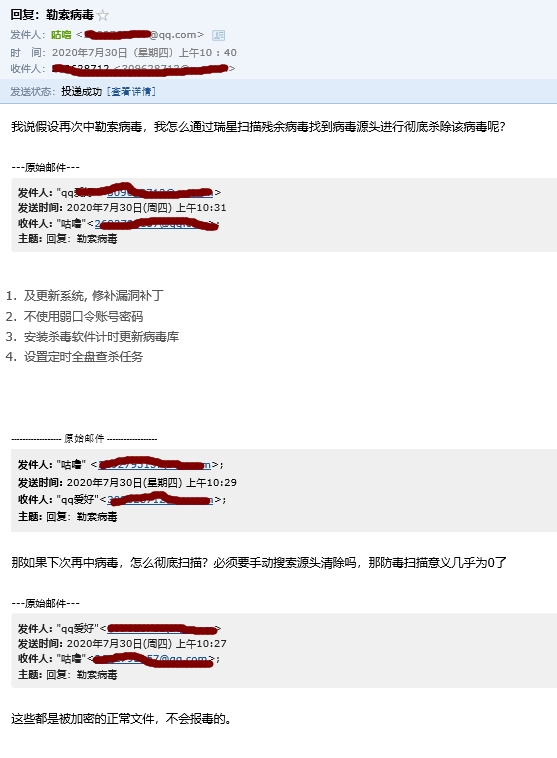 ,更可笑是的我在询问售后技术人员请教怎么通过我们大瑞星在中了勒索病毒后扫描出源头,结果售后人员一直没有正面回应。