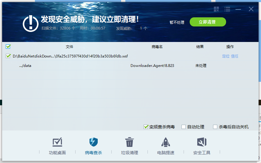 3、处理失败,看截图还是在百度网盘目录下的,怀疑是被扫描文件在共享里导致的。 不是的,这个文件夹,我专门用来放病毒文件,不用做百度下载, 并且百度网盘也没启动!